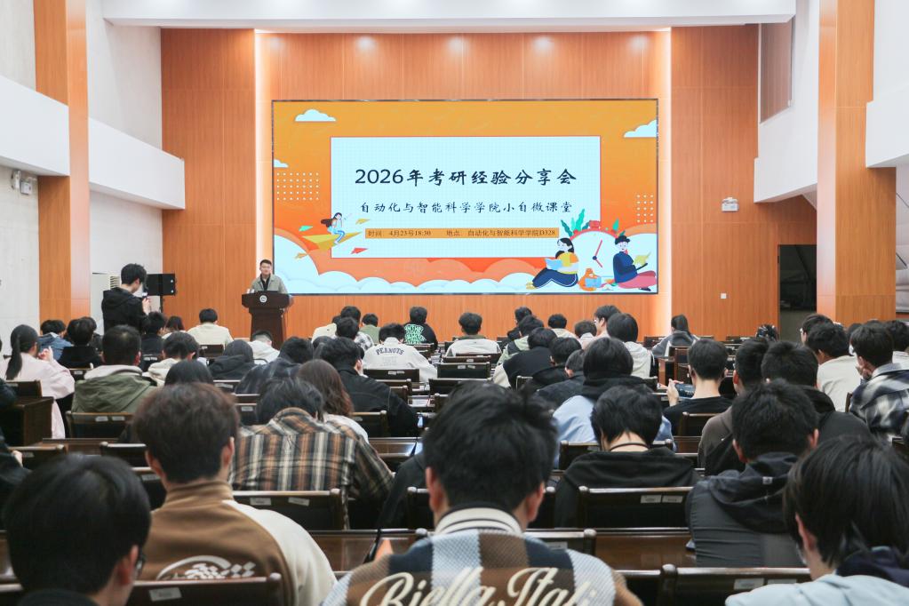 为充分发挥优秀学子的示范引领作用,帮助考研学生明确备考方向、掌握科学方法,4月23日,自动化与智能科学一本道(物联网一本道)“小自微课堂”品牌活动之考研经验分享会在一本道D328报告厅举行。活动邀请一本道2026届六位成功考取硕士研究生的优秀学子分享备考心得,各年级本科生到场参与交流。